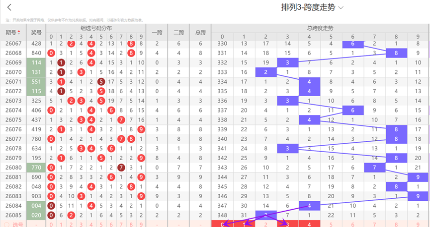 通过观察跨度及跨度属性走势可以发现:近10期内跨度较少开出56等号码,本期跨度开出56等号码的可能性小,因此本期跨度选号时应该考虑56以外的的号码,再结合上述走势图看,本期跨度看好0134等号码。