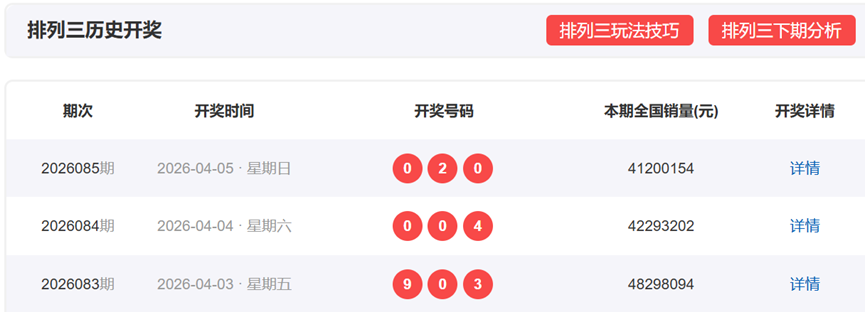 体彩排列3上一期,开奖号码为020,形态为组三,奇偶比为0:3,012路数值表现为020,和值02,和尾2,跨度2。