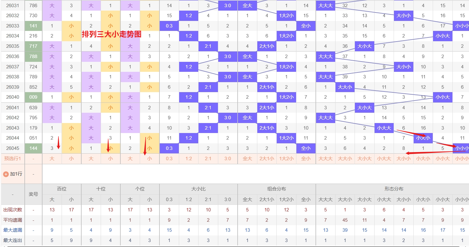 排列三 大小形态分析:从大小走势图上可以看出排列三100期内百位大小比约为53比48,十位大小比约为49:51,个位大小比约为55比45,除了个位和百位奇数比偶数多,十位偶数比奇数多。历史数据近2期开出小小小下一期的走势为,第315期开出小小小第316期开大小小。第332期开出小小小后第333期开小小大,第008期开出小小小后009期开大大小。近期排列三大小形态的走势来看,大小小是目前表现最为抢眼的热门组合,不仅出号频率密集,而且在走势图上呈现出极强的重复惯性,这种热态一旦形成往往不会骤然停止,短期内仍需重点关注其连续现身;与此同时,大大小则持续遇冷,已经形成了相当可观的遗漏缺口,按照正常的出号逻辑,冷态不可能无限期延续下去,越是大小小这种热号走强的时候,越要警惕大大小这种冷态的突然回补。所以排列三第2026046期大小形态推荐大小小防小小本文由一起彩钱是生命动力所著,请勿转载
