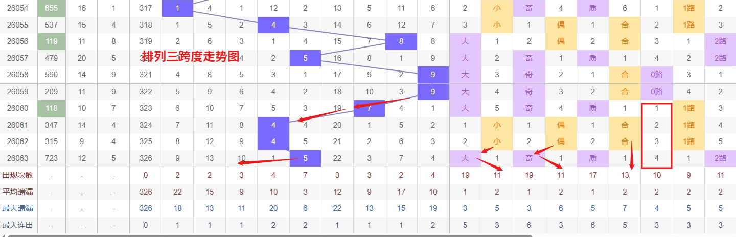 排列三 跨度分析:从上图可以看出近100期的跨度大小比约为48比52,跨度奇偶比约为45比55总体来看还是比较均衡的,但跨度大小之间有点差异。我们再从历史开出5跨后下一期3跨度数据来做参考。最近10期跨度大小比约为6:4期开出小数跨度过多返回大数跨度的概率更高一点。历史开奖近2期出5跨以后的走势为335期开出5跨后下一期走3跨走出2振幅,第342期开出5跨后下一期走6跨走1振幅第022期开出5跨后下一期开出2跨走出2振幅。连续多期小振幅,近期排列三跨度走势中,2跨作为冷号已遗漏较长时间,从历史数据看,冷态持续的时间越久,回补的动能就越强,接下来需重点防范2跨的随时出现,尤其要关注其搭配的中小号组合;而6跨目前处于温号阶段,但从其出号频率和间隔来看,有逐步转热的明显迹象,若走势延续,6跨有望成为近期热出的重点跨度,在关注6跨回温的同时,可适度结合2跨的冷号防守,跨度走出1到4个振幅看好的跨度有2367跨,所以第2026064期排列三跨度推荐2367跨。