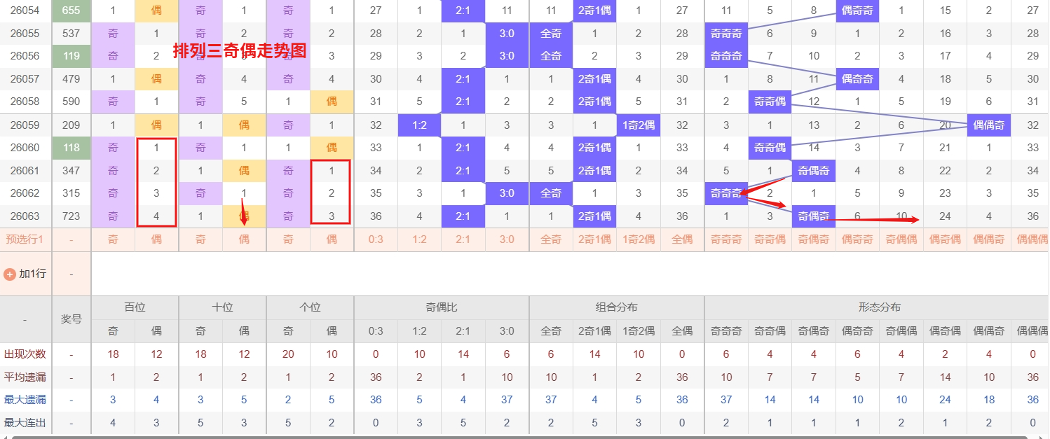排列三 奇偶分析:从上图可以看出排列三100期内百位奇偶比约为46比54,十位奇偶比为51比49,个位奇偶比为53比47,十位的比值比较均衡,但是百位的比值偏差就有点大,历史奇偶形态近2期开出奇偶奇后下一期的走势为,第331期开出奇偶奇后332期开偶奇偶, 第344期开出奇偶奇后第345期开偶奇奇,第017期开出奇偶奇后第018期开偶偶偶,近期排列三奇偶形态走势中,偶奇偶作为冷态组合已遗漏较长时间,从概率平衡的角度来看,往往是在冷态积累到一定程度后容易出现回补,接下来需重点关注偶奇偶形态的随时现身,尤其是当号码分布偏向偶数时,该形态容易作为冷门解冻;而奇偶偶则作为当前的热号,近期表现较为活跃,从其出号频率来看,仍有连开或持续走热的迹象,需防范奇偶偶形态的再次出现。综合来看,当前形态布局应以热号奇偶偶为主防,同时密切关注冷号偶奇偶的回补机会,所以排列三2026064期奇偶形态推偶奇偶与偶奇奇。