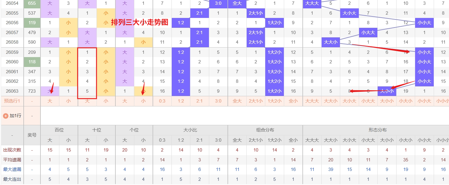 排列三 大小形态分析:从大小走势图上可以看出排列三100期内百位大小比约为45比55,十位大小比约为49:51,个位大小比约为52比48,除了个位奇数比偶数多,十位和百位偶数比奇数多。历史数据近2期开出大小小下一期的走势为,第327期开大小小后第328期开小大小。第341期开出大小小后第342期开大小大,第014期开出大小小后015期开大大大。近期排列三大小形态走势中,大小大与大大大两大组合表现尤为活跃,作为当前的核心热号,两者交替或连续出现的频率较高。从热号延展性来看,强势形态往往具备惯性,接下来需重点防范大小大与大大大的再次现身,尤其是大大大这种全大组合,若大号持续走强,则极易形成连开势头。与此同时,建议在关注这两类热号的基础上,可适当留意小大小等冷态组合的防守,所以排列三第2026064期大小形态推荐大小大防小小小。