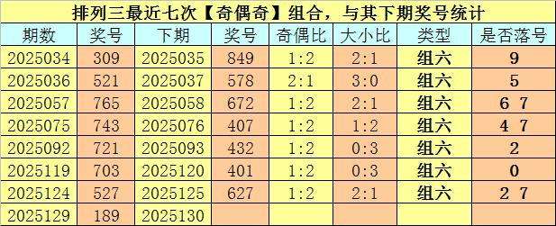 奇偶分析:排列三上期奖号为189,其奇偶类型为【奇偶奇】,最近七次出现奇偶类型奇偶奇的号码分别为:309、521、765、743、721、703、527,其下期奖号分别为:309、521、765、743、721、703、527。其中号码奇偶比为8:13,奇数奖号开出比例较低,本期注意奇数回补的可能,关注奇偶比2:1。