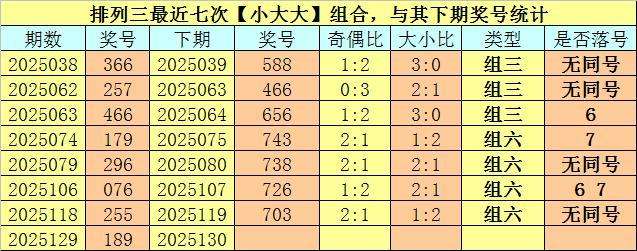 奖号类型分析:排列三最近七次【小大大】组合与【奇偶奇】组合出现之后,其下期组三号码开出3次,组六号码开出11次,其中组六号码开出频率非常热,本期预计继续开出组六号码。另外,其下期开奖有10期奖号包含了重号,本期预计继续开出重号,参考号码8。