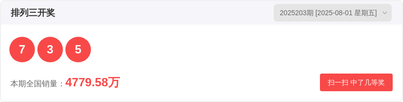 排列325203期开奖结果7 3 5,大小比2:1,豹子/组三/组六为组六,和值15,和值尾5。