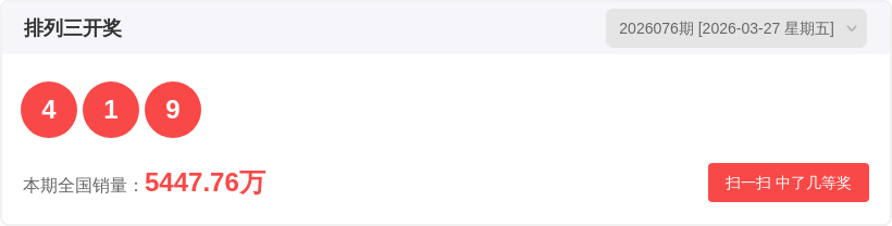 排列326076期开奖结果4 1 9,大小比1:2,跨度8,012路比1:2:0,和值14。