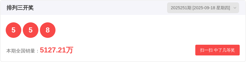 排列325251期开奖结果5 5 8,012路比0:0:3,和值18,质合比2:1,大小比3:0。