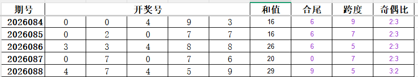 - 和值:所有数字相加总和29;- 合尾:9;- 跨度:5;- 奇偶比:3:2。