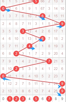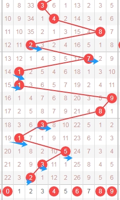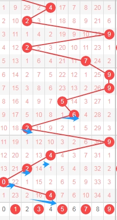 上图是体彩排列五从左到右定位第三位数字,我标注出来的蓝色箭头表示奇数数字,很明显最近十几期开出的奇数数字多,最近6期开出合数数字5个,开出奇数数字一个,那么本期第三位数字可以关注出奇数数字13579,个人最看好数字1357。