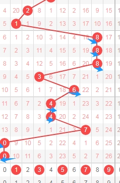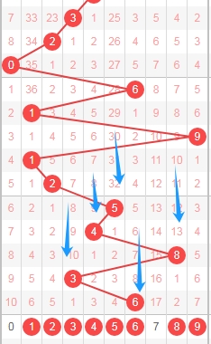 上图是体彩排列五从左到右定位第五位数字,我标注出来的蓝色箭头表示遗漏周期,上期开出数字6遗漏周期是8期,上上期开出数字3遗漏周期是10期,那么本期可以额关注出遗漏周期小的数字12345689,个人最看好数字2369。