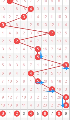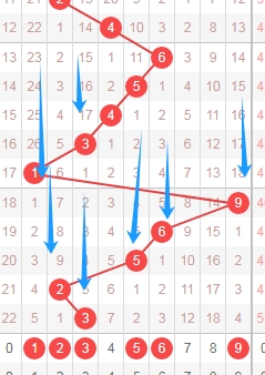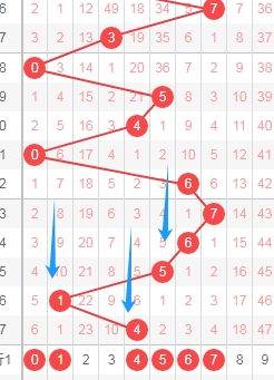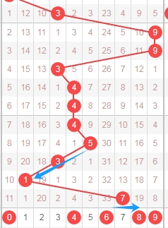 上图是体彩排列五从左到右定位分析第一位走势图,我在上面走势图中标注出来的数字014567是遗漏周期小的数字,最近三期遗漏周期用蓝色箭头标注出来了,根据这个遗漏周期分析,本期看好遗漏周期小的数字,个人最看好数字017。