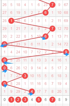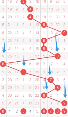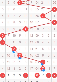 上图是体彩排列五从左到右定位第二位数字,我标注出来的蓝色小箭头都是质数数字,很明显最近开出的质数数字多,那么本期第二位数字可以关注出合数数字04689,个人最看好数字4689。