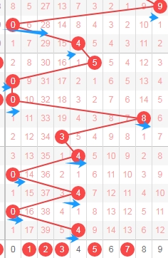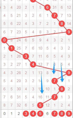 上图是体彩排列五从左到右定位第四位数字,我标注出来的蓝色小箭头表示遗漏周期,上期开出数字5遗漏周期是16期,根据这些遗漏周期分析,本期第四位数字可以关注出遗漏周期小的数字345789,个人最看好数字34589。