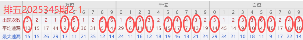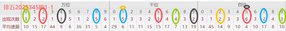 下图所圈出的为近30期各位置所出现的热码出现次数及平均遗漏值,用以参考和一些冷码组合选号。
