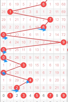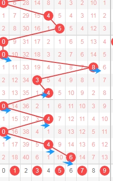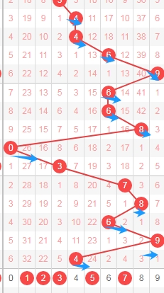 上图是体彩排列五从左到右定位第二位走势图,我标注出来的蓝色小箭头是质数数字,很明显质数数字连续开出了5期,那么本期第二位数字可以关注出合数数字,那么就是数字04689,个人最看好数字0468。
