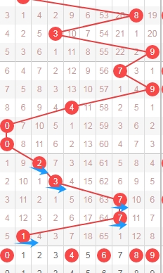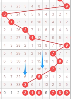 上图是体彩排列五从左到右定位第四位走势图,我标注出来的蓝色小箭头表示遗漏周期,上期开出数字3遗漏周期是6期,上上期开出数字5遗漏周期是16期,那么本期可以关注出遗漏周期小的数字345789,个人最看好数字3459。