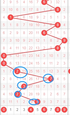 上图是体彩排列五从左到右定位第三位数字走势图,我在上面走势图中标注出来的蓝色圈圈表示的都是质数,最近连续5期这位数字开奖号码都是质数,那么本期个人观点关注这位数字合数,因为前面开出的质数越多,那么后面开出合数的机会就多,尤其最近连续5期开出的都是质数。所以这位数字关注出合数04689。