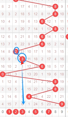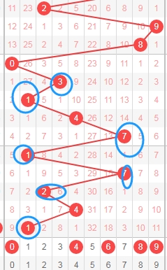 上图是体彩排列五从左到右定位第五位数字走势图,我在上面走势图中标注出来的蓝色圈圈都是质数,看上面的蓝色圈圈明显多,也就是说最近这位数字开出的质数多,合数少,那么前面开出质数多,后面开出合数的机会就大,所以本期这位数字关注出合数04689。
