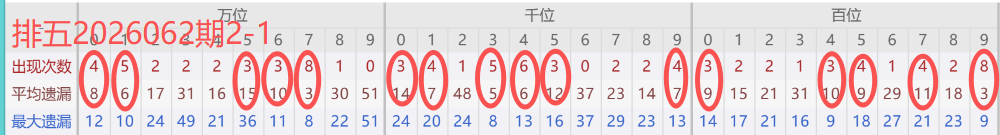 下图所圈出的为近30期各位置所出现的热码出现次数及平均遗漏值,用以参考和一些冷码组合选号。