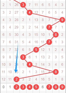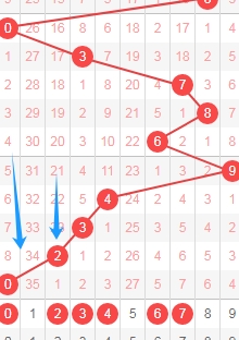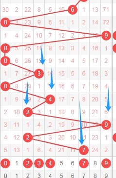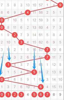 上图是体彩排列五从左到右定位第二位数字,我标注出来的数字都是遗漏周期小的数字0123567,我标注出来的蓝色箭头表示遗漏周期,上期开出数字6遗漏周期是67期,那么本期可以关注出遗漏周期小的数字,个人最看好数字23567。
