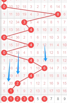 上图是体彩排列五从左到右定位第三位数字,我标注出来的数字都是遗漏周期小的数字012346,我标注出来的蓝色箭头表示遗漏周期,上期开出数字1遗漏周期是20期,那么本期可以关注出遗漏周期小的数字,个人最看好数字01346。