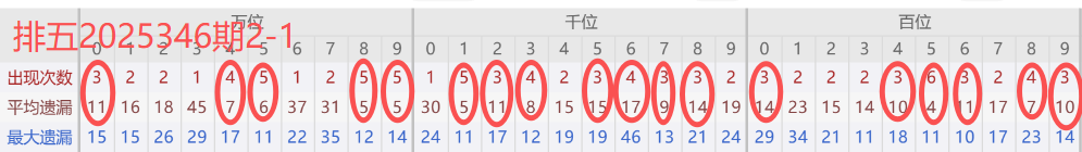 下图所圈出的为近30期各位置所出现的热码出现次数及平均遗漏值,用以参考和一些冷码组合选号。