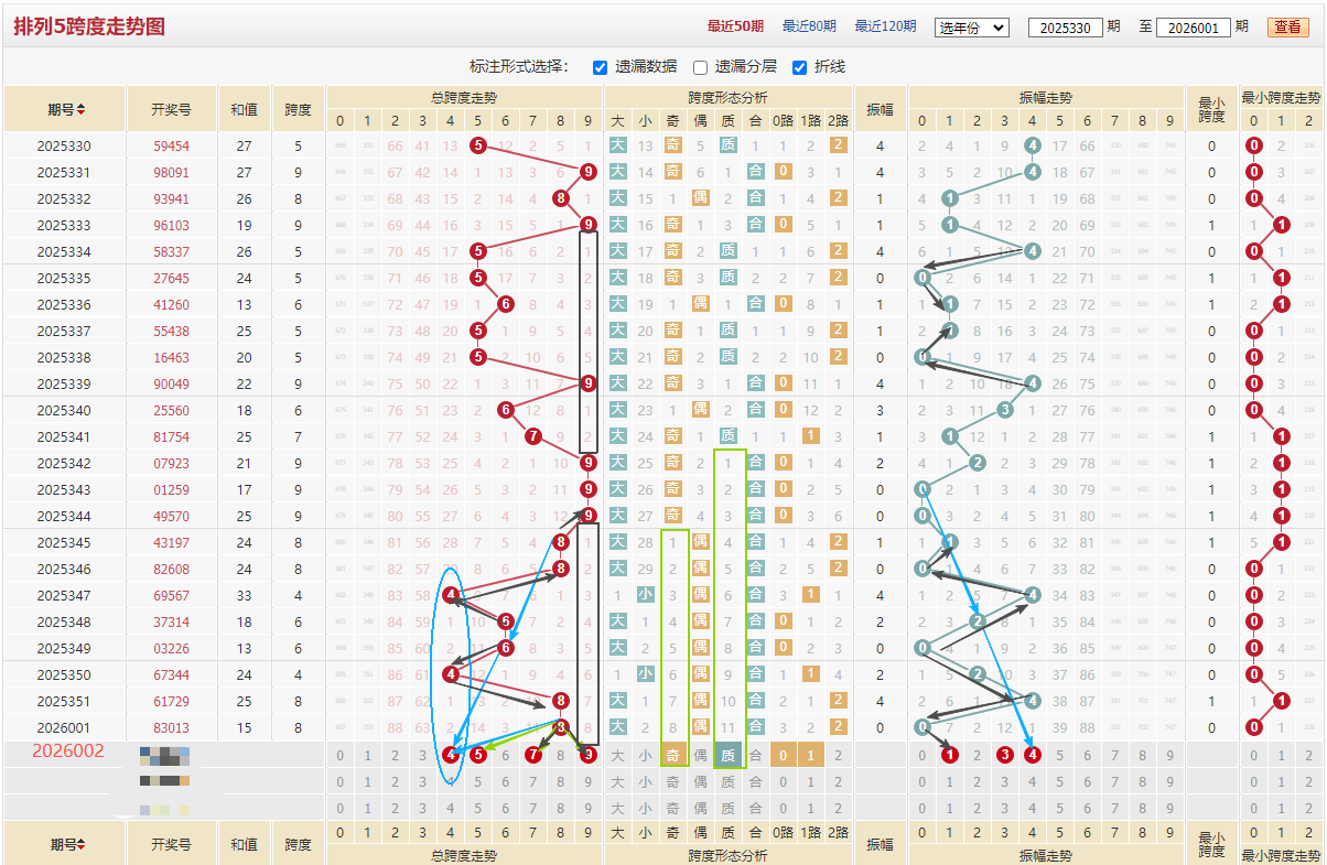 上期开出小合跨度8跨,连续开出11期合跨,历史数据也没出过几次,已经到了瓶颈期,可以考虑质跨开出,偶数连续同形态开出8期,奇数跨度需重点关注,质跨这两期要开出抓住机会,如上图振幅走势,黑色箭头所示401和401等隔形态下来对应跨度79,蓝色箭头0/2/4等隔下来对应跨度4,看左边蓝色线8/6/4,蓝色圆形里4/4/4,黑色框9隔8期开出,黑色线【9884664889】对称性太好了不得不防守,本期个人重点看质跨579,综合上述分析推荐002期跨度:4579/57