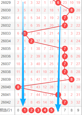 上图是体彩排列三开奖号码从左到右定位第二位走势图,我在上面标注出来的数字023589都是遗漏周期小的,你们看看上面走势图中标注出来的蓝色大箭头都是遗漏周期大的,上期开出数字9遗漏周期是13,最近几期开出数字遗漏周期大,本期关注遗漏周期小的数字,个人最看好数字235。