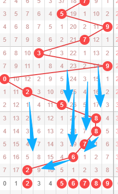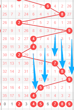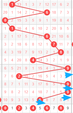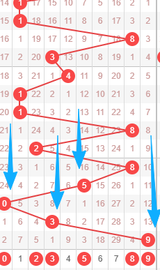上图是体彩排列三开奖号码从左到右定位第四位走势图,我在上面标注出来的数字256789都是遗漏周期小的数字,你们看看竖向蓝色箭头开出的号码都是遗漏周期大的数字,还有斜向蓝色箭头最近的号码一直往左边走,连续走了4期左边,那么本期继续往左边不看好,所以本期第四位数字我觉得是256789,我最看好数字569。