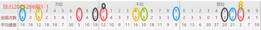 下图所圈出的为近30期各位置所出现的热码出现次数及平均遗漏值,用以参考和一些冷码组合选号。