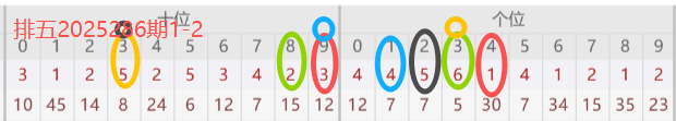 - 各位置出现频率:查看近30期数据,万位9出现2次,千位0出现3次,百位5出现3次,十位3出现5次,个位2出现5次。