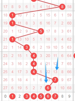 上图是体彩排列五从左到右定位第一位数字,我标注出来的蓝色箭头表示遗漏周期,上期开出数字6遗漏周期是23期,那么本期第一位数字关注遗漏周期小的数字,那么就是数字134567,个人最看好数字1357。