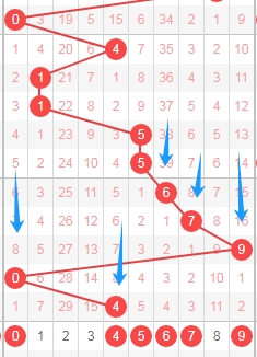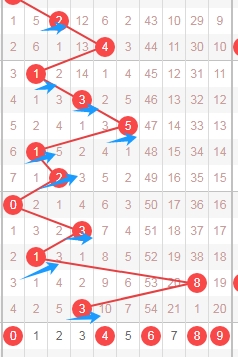 上图是体彩排列五从左到右定位第五位数字,我标注出来的蓝色箭头表示合数数字,很明显蓝色小箭头多,那么合数数字前面开出的多,本期可以关注出质数数字12357,个人最看好数字2357。