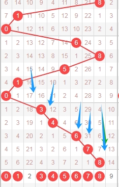 上图是体彩排列五从左到右定位第四位数字,我标注出来的蓝色箭头表示遗漏周期,上期开出数字8遗漏周期是8期,上上期数字7遗漏周期是31期,那么本期可以关注出遗漏周期小的数字01345678,个人最看好数字0145。