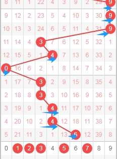 上图是体彩排列五从左到右定位第二位数字,我标注出来的蓝色箭头表示质数数字,很明显最近质数数字比较多,那么本期第二位数字可以关注出合数数字04689,个人最看好数字0469。