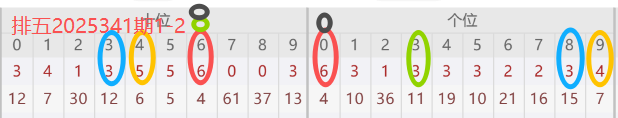 - 各位置出现频率:查看近30期数据,万位2出现2次,千位5出现3次,百位5出现6次,十位6出现6次,个位0出现6次。
