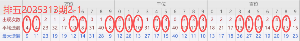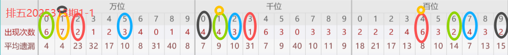 下图所圈出的为近30期各位置所出现的热码出现次数及平均遗漏值,用以参考和一些冷码组合选号。