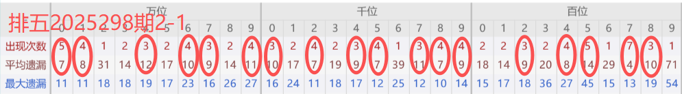 下图所圈出的为近30期各位置所出现的热码出现次数及平均遗漏值,用以参考和一些冷码组合选号。