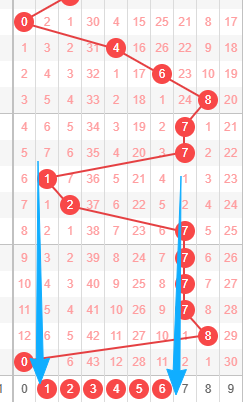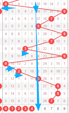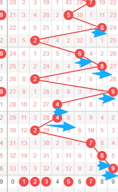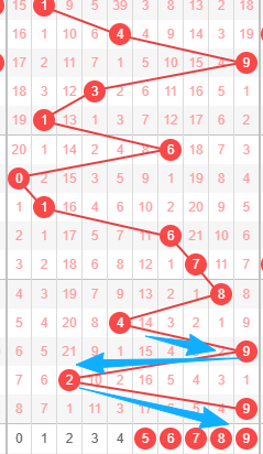 上图是体彩排列三从左到右定位的第三位数字走势图,我在上面走势图中标注出来的数字56789,我觉得本期这位数字出跨度小的走势,因为你们看看上面走势图中标出来的蓝色箭头最近两期的跨度都是7,数字2到数字9跨度是7,来回两次跨度都是7,都是大跨度,那么本期考虑出小跨度,出小跨度的话,那么范围就是数字56789,个人最看好数字569。