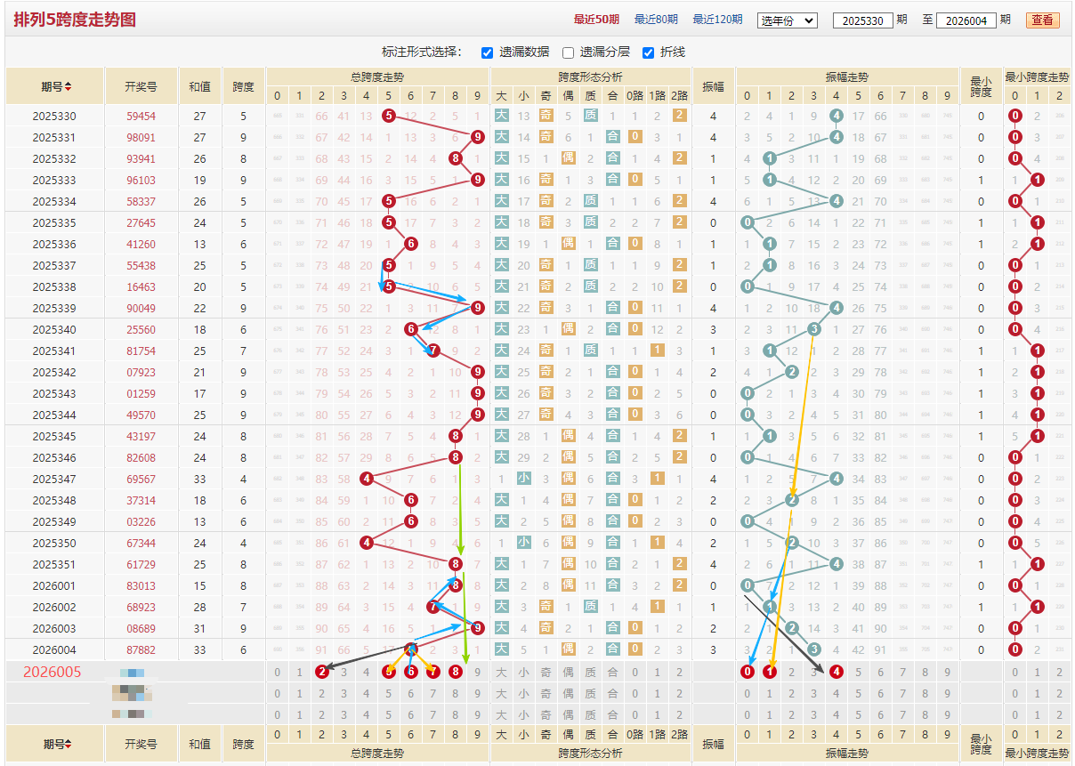 上期开出大合跨度6跨,质跨开一期隔期又开出2期合跨,如上图振幅走势,蓝色箭头2/1/0等隔2期形态下来对应跨度6,黄色箭头3/2/1对应跨度57,黑色箭头1/2/3/4对应跨度2,看左边绿色箭头8/8/8等隔4期开出,蓝色箭头76955和87966同形态走势,综合上述分析推荐005期跨度:25678/57