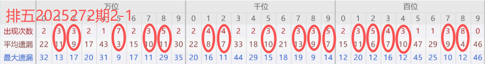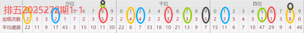 下图所圈出的为近30期各位置所出现的热码出现次数及平均遗漏值,用以参考和一些冷码组合选号。