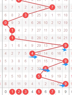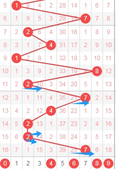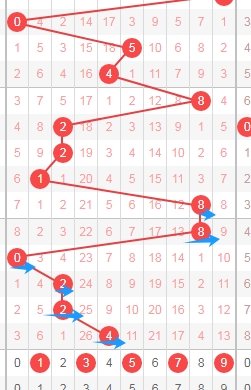 上图是体彩排列五从左到右定位分析第五位走势图,我在上面走势中标注出来的数字是合数13579,你们看上面走势图中标注出来的蓝色小箭头就知道,最近连续开出了3期质数数字,那么本期这位数字大家要留意出合数04689。