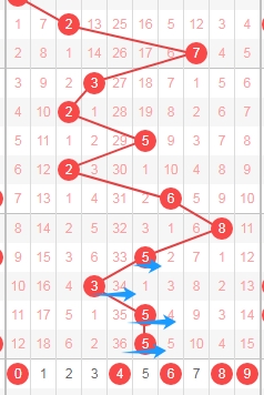上图是体彩排列五从左到右定位分析第二位走势图,我在上面走势中标注出来的数字是质数12357,你们看上面走势图中标注出来的蓝色小箭头就知道,最近连续开出的合数多,开出的质数少,那么本期这位数字大家要留意出质数12357。个人看好数字3和数字2。