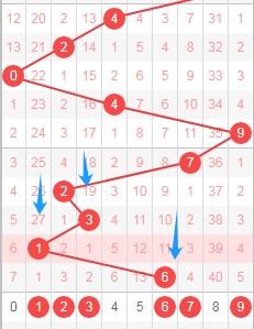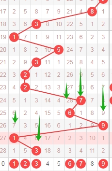 上图是体彩排列五从左到右定位第一位数字,我标注出来的蓝色箭头表示遗漏周期,上期开出数字6遗漏周期是11期,上上期开出数字1遗漏周期是27期,那么根据最近几期开出的遗漏周期来分析的话,本期第一位数字可以关注出遗漏周期小的数字123679。