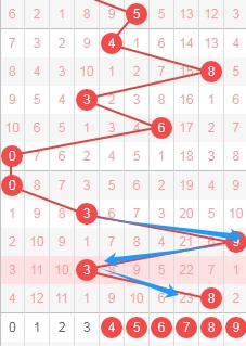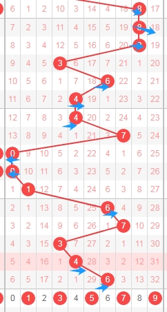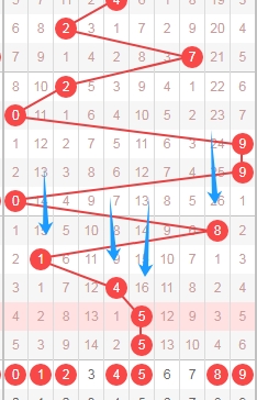 上图是体彩排列五从左到右定位第五位数字,我标注出来的蓝色箭头表示走势跨度,上期跨度是5,数字3走数字8跨度是5,前面数字3走数字9跨度是6,可以发现最近三期走的跨度都大,那么本期可以关注出小跨度的数字456789,个人最看好数字45679。