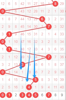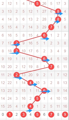 上图是体彩排列五从左到右定位分析第一位走势图,我在上面走势图中标注出来的数字是我看好的数字013457,你们看看上面走势图中标注出来的蓝色大箭头表示遗漏周期,上期开出的数字4遗漏周期是21期,上上期开出数字5遗漏周期是36期,那么根据这个遗漏周期分析,本期排列五第一位数字出遗漏周期小的数字机会就大了,关注数字013457,个人最看好数字345。