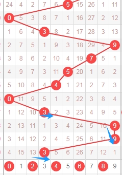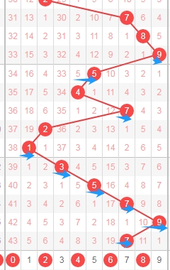 上图是体彩排列五从左到右定位分析第三位走势图,我在上面走势图中标注出来的数字0123457是我看好的数字都是遗漏周期小的,因为你们看上面走势图中标准出来的蓝色箭头表示遗漏周期,上期开出数字5遗漏周期是7期,最近开出的遗漏周期没有出现小的周期,那么本期可以关注出遗漏周期小的数字0123457,个人最看好数字1245。