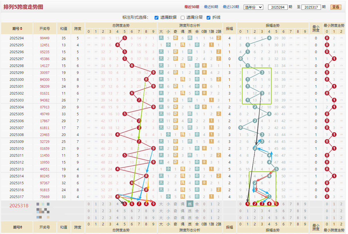 上期开出小合跨度4跨,连续开出6期合夸,本期个人重点看质数跨度,如上图振幅走势,红色箭头所示542245同样形态走势对应跨度9,蓝色箭头4423和2243一样的折线对应跨度7,绿色框里的31131和42242一样走势对应跨度6,黑色线3/2/1下来看5跨度,左边绿色线8/7/6,蓝色线9/8/7都是等隔下来,综合上述分析推荐318期跨度:56789