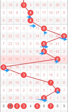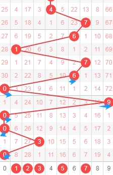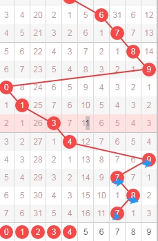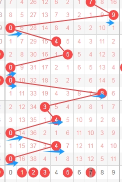 上图是体彩排列五从左到右定位第四位数字,我标注出来的蓝色小箭头都是跨度,最近几期走的都是小跨度,那么本期可以关注出大跨度的数字,那么就是数字01234,个人最看好数字0134。
