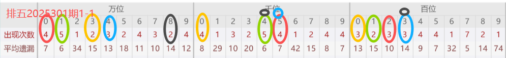下图所圈出的为近30期各位置所出现的热码出现次数及平均遗漏值,用以参考和一些冷码组合选号。